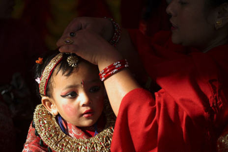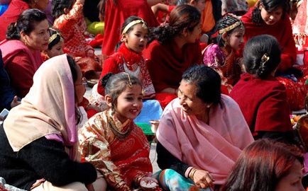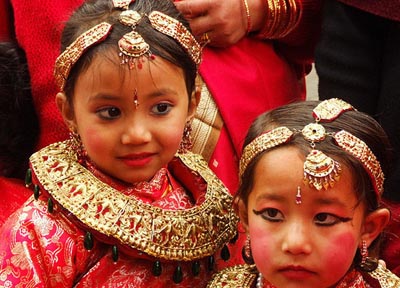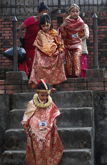 尼瓦爾族女孩一生“結(jié)”三次婚,第一次嫁給木蘋果(孟加拉蘋果),稱之為果實(shí)婚;第二次嫁給“太陽(yáng)”;第三次才是與一個(gè)男人結(jié)為夫婦。