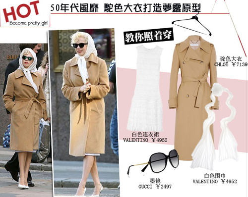 近期大熱的電影《我與夢露的一周》中,米歇爾·威廉姆斯(MichelleWilliams)給我們重現(xiàn)了夢露的經(jīng)典造型。其中,這套身著脫色外衣、頭戴白圍巾的50年代裝扮讓大家記憶深刻。一件簡單的駝色大衣,一條圍巾搭配一架墨鏡,露出纖細小腿配雙小細跟鞋,如果你也想嘗試下復古的感覺,那千萬不能錯過