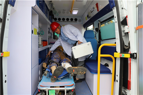 施工現(xiàn)場(chǎng),一處樓體地基圍墻處出現(xiàn)塌方,警報(bào)響起,現(xiàn)場(chǎng)警戒,消防車、救護(hù)車呼嘯而至。消防人員緊急出動(dòng),攜帶工具沖到事故點(diǎn),對(duì)塌方土方進(jìn)行處理,一名建筑工人(模型)被從塌方土堆中救出,醫(yī)院救護(hù)人員立即施救,然后抬入救護(hù)車做進(jìn)一步搶救。