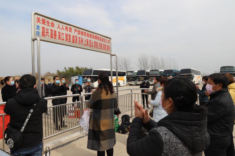 發(fā)車前,港區(qū)管委會主任程若光攜方便面、火腿腸和飲料到場為農(nóng)民工送行,程若光向車上工作人員要求,不要在沿途停靠,途經(jīng)服務(wù)區(qū)需要如廁時,要組織人員有序前往,乘客返回車上之前,要為他們做好消毒。