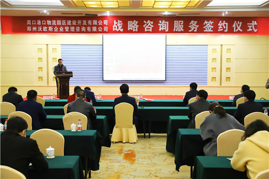 簽約儀式上,周口港口物流園區(qū)建設(shè)開發(fā)有限公司董事長李培超與鄭州沃歐斯企業(yè)管理有限公司總經(jīng)理阮肇民簽訂了戰(zhàn)略咨詢服務(wù)協(xié)議。
