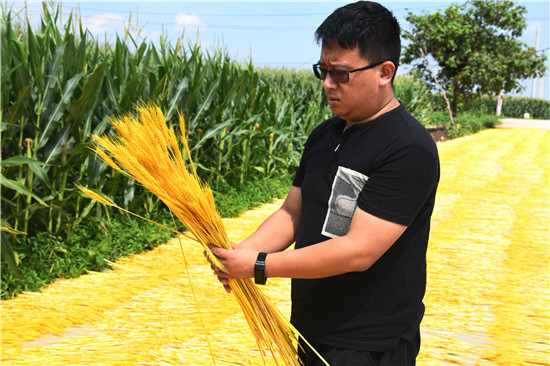8月18日中午,商水縣譚莊鎮(zhèn)三李村村民正在察看晾曬中的小麥秸稈。