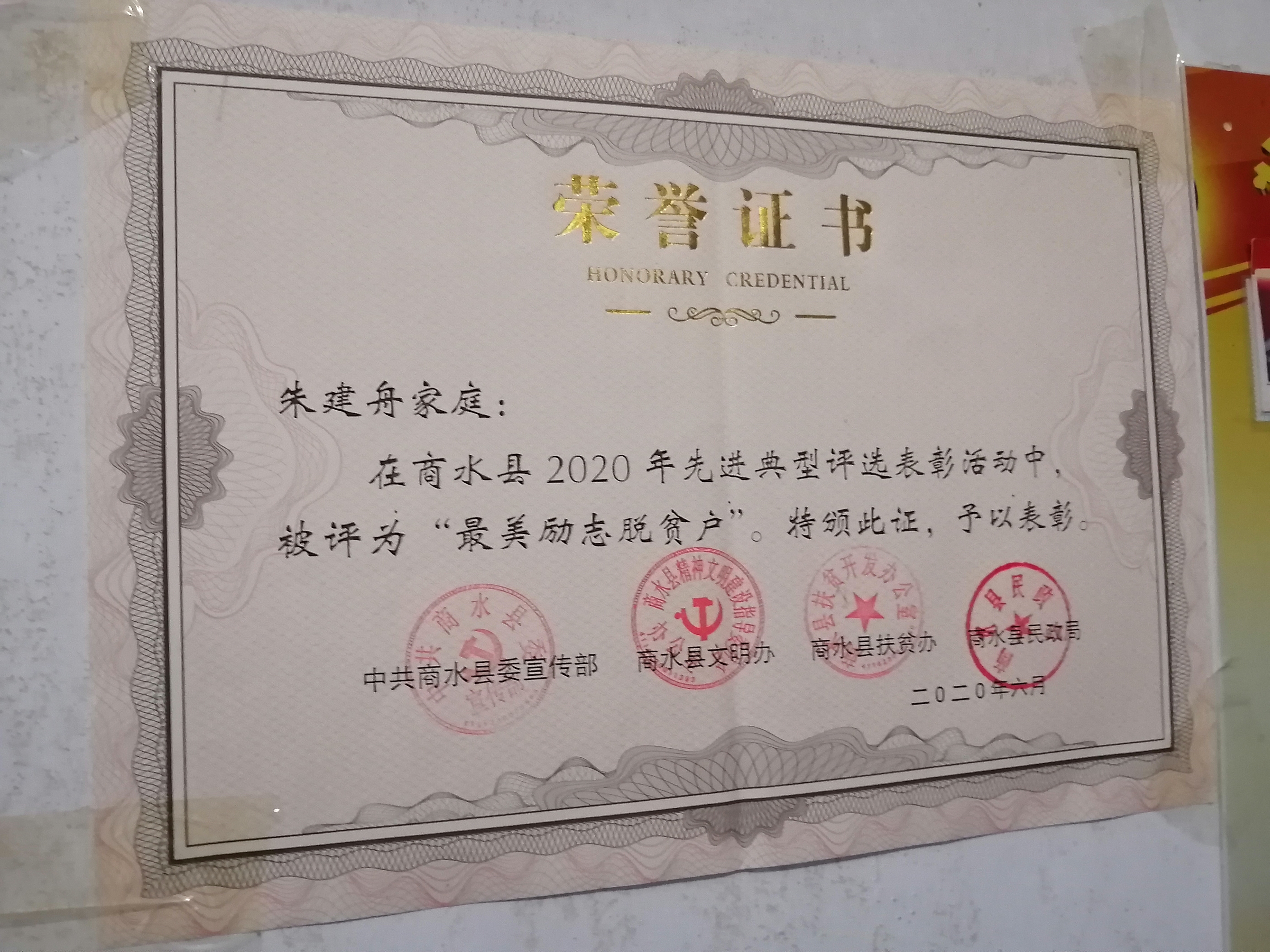 由于鄉(xiāng)村干部和駐村工作隊的大力幫扶,加上朱建舟夫妻二人勤勞能干,在2018年順利脫貧。同時,他被朱屯村委評為勵志脫貧戶,戴上了大紅花。2019年袁老鄉(xiāng)政府評為勵志脫貧戶。2018年又被商水縣政府評為勵志脫貧戶,獎給一臺洗衣機。