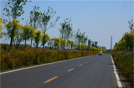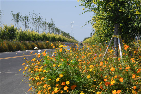 9月2日,富裕起來的農(nóng)民駕車行駛在商水縣高標(biāo)準(zhǔn)農(nóng)田示范區(qū)內(nèi)兩側(cè)開滿鮮花的田間道路上。秋天到來,5萬畝示范區(qū)內(nèi)縱橫交叉的近20公里田間道路兩側(cè)混種的格?;?、波斯菊、百日草等在燦爛的陽光下爭奇斗艷,與長勢喜人、豐收在望的秋作物相映成輝,引來許多市民前來觀賞。記者付永奇攝