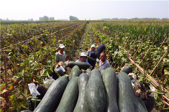 9月2日,在商水縣袁老鄉(xiāng)李莊村冬瓜種植基地,瓜農(nóng)們正在采摘黑皮冬瓜裝車(chē)外運(yùn)。