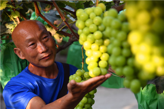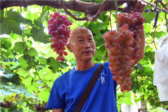 9月10日,商水縣農業(yè)專家劉啟山在綠苑葡萄園內察看葡萄生長情況。