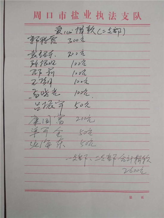 支隊(duì)黨委得知這一情況后,高度重視,隨即向全體黨員發(fā)起了《捐款獻(xiàn)愛心倡議書》,號召全體黨員進(jìn)行捐款,奉獻(xiàn)一份愛心。第一、第二黨支部積極行動(dòng),大家踴躍捐款。截止到11日上午,共捐款2600元。