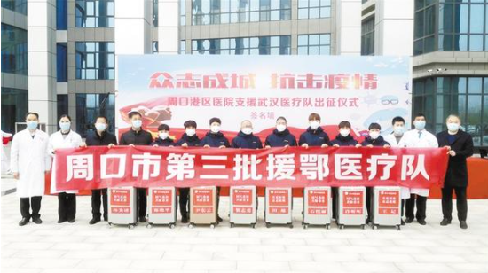 2月13日,該院經(jīng)領(lǐng)導(dǎo)班子研究決定,擬籌備周口港區(qū)醫(yī)院(周口燒傷醫(yī)院)增援武漢醫(yī)療隊(duì),為隨時(shí)增援武漢做準(zhǔn)備。2月14日,該院召開了增援武漢醫(yī)療隊(duì)動員會,各科室負(fù)責(zé)人及預(yù)報(bào)名的同事40余人參會。最終在報(bào)名的40余位醫(yī)護(hù)人員中抽調(diào)賀志勇、尹東云等8位精兵強(qiáng)將,由院長賀志勇親自帶隊(duì),每日進(jìn)行針對性的專業(yè)培訓(xùn),為隨時(shí)增援武漢做準(zhǔn)備。3月3日上午,周口市第三批援鄂醫(yī)療隊(duì)暨周口港區(qū)醫(yī)院(周口燒傷醫(yī)院)支援武漢醫(yī)療隊(duì)出征儀式,在周口港區(qū)醫(yī)院(周口燒傷醫(yī)院)舉行。市政府副市長秦勝軍、港區(qū)管委會主任程若光等出席儀式并為醫(yī)療隊(duì)送行。3月3日晚7時(shí)許,周口港區(qū)醫(yī)院(周口燒傷醫(yī)院)援鄂醫(yī)療隊(duì)抵達(dá)對口支援的武漢商職醫(yī)院,3月4日正式開始醫(yī)療支援工作。從3月3日至4月1日共29天里,他們累計(jì)收治117名新冠肺炎患者,其中包括2名危重癥患者、28名重癥患者和4名失能患者,并實(shí)現(xiàn)了醫(yī)務(wù)人員零感染、患者零死亡、零投訴的“三零”戰(zhàn)績。