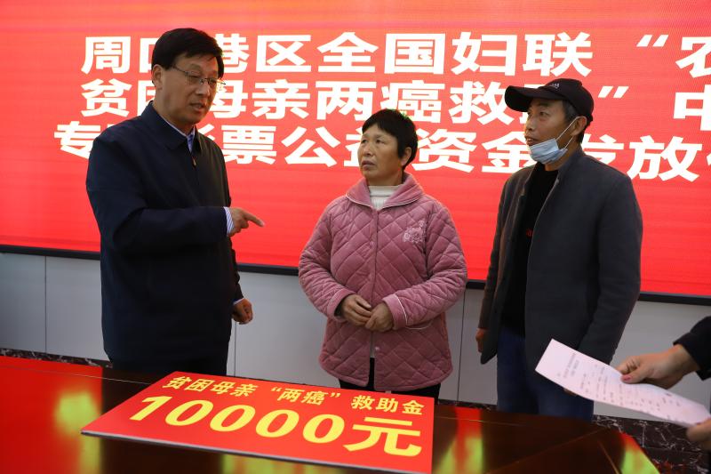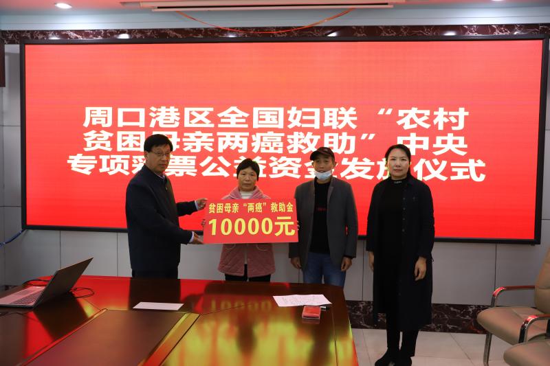 11月19日上午,周口港區(qū)婦聯(lián)舉行全國婦聯(lián)“農(nóng)村貧困母親兩癌救助”中央專項彩票公益金資金發(fā)放儀式,向受到救助的李埠口鄉(xiāng)苑老村的“兩癌”貧困母親李貴平發(fā)放救助金1萬元。周口港區(qū)黨委委員張東立、港區(qū)婦聯(lián)副主席劉影及相關工作人員參加了發(fā)放儀式。
