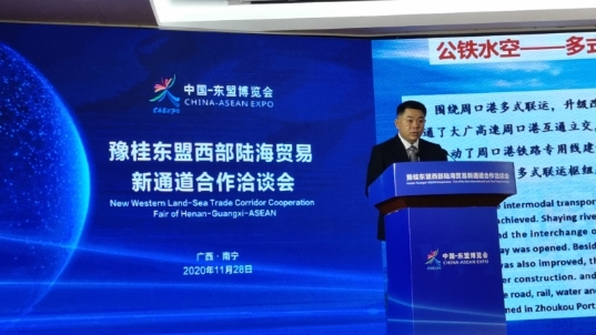 11月27日,第17屆中國——東盟博覽會在廣西南寧拉開帷幕,周口港區(qū)隨河南代表團(tuán)亮相盛會。在開幕式次日舉辦的豫桂東盟西部陸海貿(mào)易新通道合作洽談會上,周口港區(qū)黨委書記孫紅偉登臺演講,向國內(nèi)外參會嘉賓、客商推介周口中心港多式聯(lián)運(yùn)便利條件以及港區(qū)招商引資優(yōu)厚政策,令與會人員眼前一亮。一家來自越南的進(jìn)出口貿(mào)易企業(yè),當(dāng)場與港區(qū)企業(yè)簽訂進(jìn)出口貿(mào)易長期合作協(xié)議。