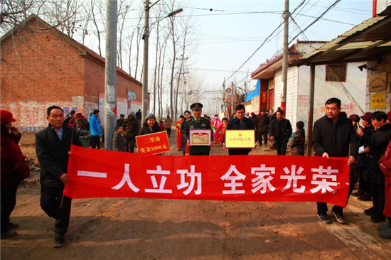 “咚咚鏘……”腰鼓響起來(lái),彩綢凌空飛舞。敲鼓人得意的搖頭晃腦,將喜悅綻放在臉上,商水縣黃寨鎮(zhèn)高灣村高永紅家成了全村人眼球的焦點(diǎn)。1月26日,商水縣人民武裝部政委劉衛(wèi)華和商水縣退役軍人事務(wù)局工作人員組成的聯(lián)合派送喜報(bào)小組為二等功臣高永紅的家屬前來(lái)恭賀。同時(shí),榮立二等功的王俊濤、劉國(guó)席家里也收到了同樣的賀禮。