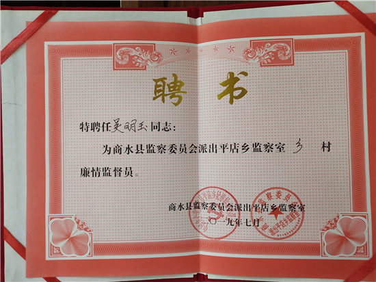 “我鄉(xiāng)劉樓村黨支部書記吳明玉敢于擔(dān)當(dāng),一身正氣,認(rèn)真履行村干部的工作職責(zé),在全鄉(xiāng)起了很好的示范作用,經(jīng)鄉(xiāng)紀(jì)委研究報(bào)請(qǐng)鄉(xiāng)主要領(lǐng)導(dǎo)同意,特對(duì)吳明玉進(jìn)行通報(bào)表?yè)P(yáng),即日起聘請(qǐng)吳明玉同志為平店鄉(xiāng)廉情監(jiān)督員。請(qǐng)吳明玉同志上臺(tái)接受聘書......”近日,商水縣平店鄉(xiāng)召開(kāi)例會(huì),縣紀(jì)委委員、鄉(xiāng)黨委副書記邵國(guó)闖宣讀了一份“特殊通報(bào)”,并當(dāng)場(chǎng)頒發(fā)了聘書。
