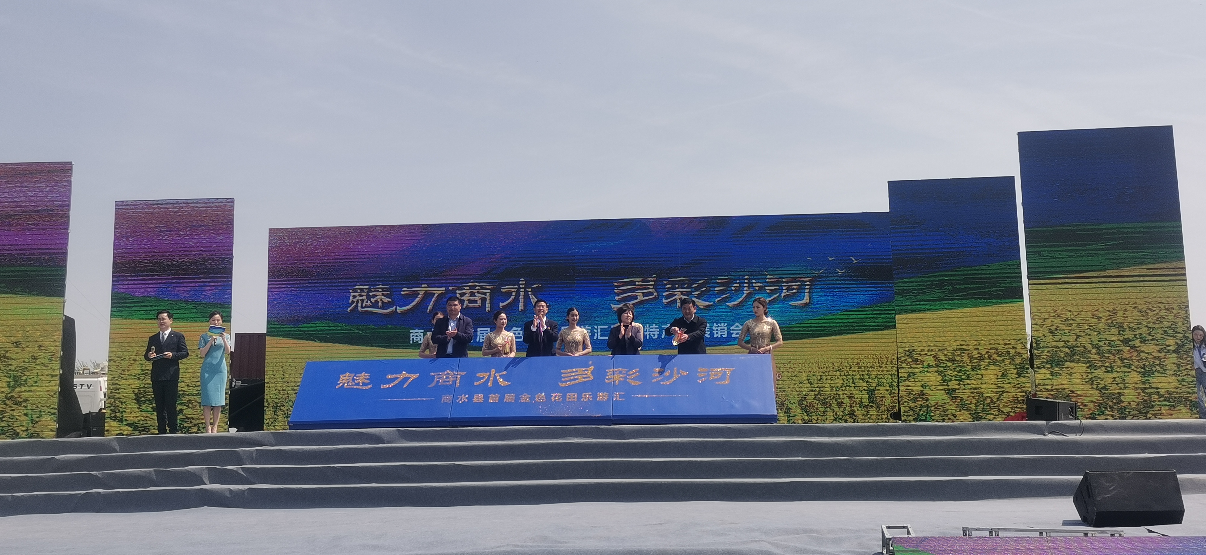 在開(kāi)幕式上,歡歌熱舞熱情奔放,驚險(xiǎn)雜 技技驚四座,唐俑表演俏皮可愛(ài),一個(gè)個(gè)精彩演出引得游客們掌聲、歡呼聲不斷。一旁的農(nóng)副產(chǎn)品展銷臺(tái)前,鄧城豬蹄、白寺草莓等農(nóng)特產(chǎn)品更是引得游客爭(zhēng)相購(gòu)買。同時(shí),現(xiàn)場(chǎng)還進(jìn)行了首屆魅力商水多彩沙河金色花田樂(lè)游匯首日封發(fā)行儀式,以作開(kāi)幕紀(jì)念。