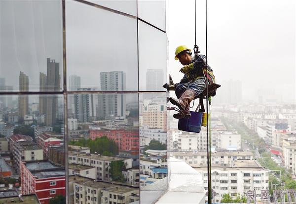 近日,一名“蜘蛛人”在中心城區(qū)一座大樓的外墻面認(rèn)真作業(yè),為城市的美麗和整潔貢獻(xiàn)著自己的力量。 段繼軍 攝