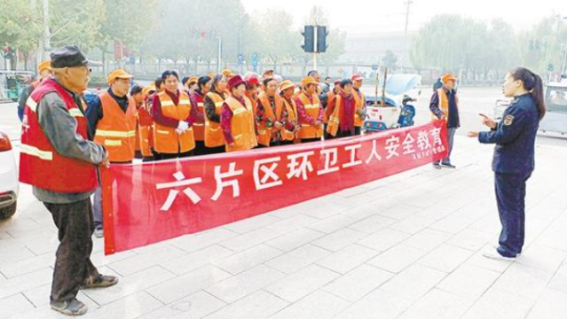 項(xiàng)城市城管局六片區(qū)負(fù)責(zé)人為環(huán)衛(wèi)工人講解安全知識(shí)