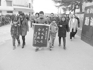 本報(bào)訊 (記者 朱紅 文/圖)3月7日本報(bào)以《姜振英:冰河救起雙胞胎》為題報(bào)道了沈丘縣縣直高中教師姜振英冰河勇救落水雙胞胎的英勇事跡。昨日上午,沈丘縣縣直高中鑼鼓喧天、格外熱鬧。在鑼鼓聲中,得救孩子和親屬一起將一面寫有“見義勇為 舍身救人”的錦旗送到姜振英手中。