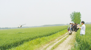 5月7日,一架小型直升機(jī)為小麥噴灑農(nóng)藥。當(dāng)前,正是小麥 “一噴三防”的關(guān)鍵時(shí)期,項(xiàng)城市三店鎮(zhèn)多方聯(lián)系,引進(jìn)小型直升機(jī)為小麥高產(chǎn)示范田噴灑農(nóng)藥,為豐產(chǎn)豐收奠定良好基礎(chǔ)。董方靈 攝