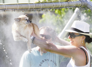 熱浪襲擊溫哥華      6月27日, 在加拿大溫哥華, 一名女子利用街頭的噴水設(shè)施為寵物狗降溫。據(jù)加拿大環(huán)境部門檢測(cè),不列顛哥倫比亞省沿岸地區(qū)當(dāng)日最高氣溫達(dá)攝氏三十度,內(nèi)陸地區(qū)升至四十度。溫哥華市政府已發(fā)出高溫預(yù)警,呼吁民眾外出時(shí)注意身體狀況,謹(jǐn)防中暑。新華社發(fā)